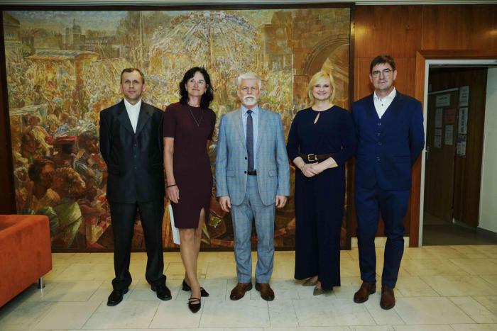 S velkou poctou se autoři díla a zástupci naší školy setkali osobně s panem prezidentem Petrem Pavlem před besedou s občany v Nymburce ve středu v podvečer v sále Obecního domu. Pan prezident vyjádřil velký obdiv a poděkování za tento, jeho srdci, milý dárek a s velkým respektem se vyjádřil k ruční práci zmíněných mistrů a žáka Ježka. Osobní setkání a krátký rozhovor s hlavou státu byl pro všechny velkou odměnou a potěšením. Došlo i na společnou fotografii, kterou si můžete prohlédnout níže.