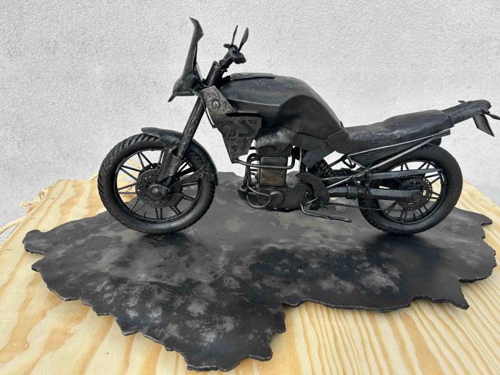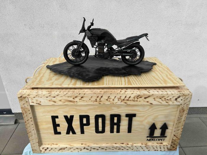 Výsledkem jejich práce je naprosto unikátní a skvostný ukovaný model motorky, stojící na reliéfní mapě ČR. To vše ukryté v dřevěné bedně s nápisem EXPORT. Vše do detailu ručně zpracované.
