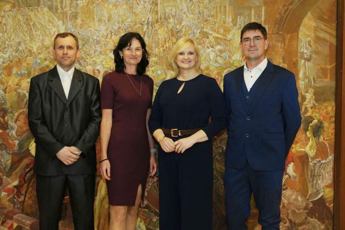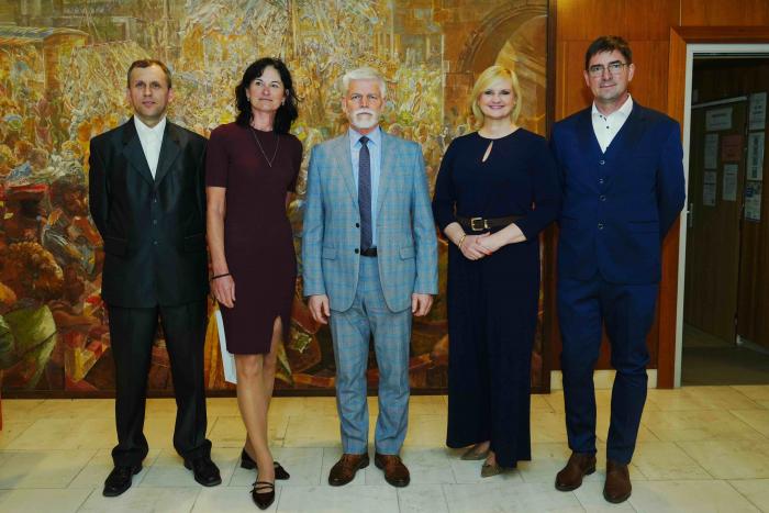 S velkou poctou se autoři díla a zástupci naší školy setkali osobně s panem prezidentem Petrem Pavlem před besedou s občany v Nymburce ve středu v podvečer v sále Obecního domu. Pan prezident vyjádřil velký obdiv a poděkování za tento, jeho srdci, milý dárek a s velkým respektem se vyjádřil k ruční práci zmíněných mistrů a žáka Ježka. Osobní setkání a krátký rozhovor s hlavou státu byl pro všechny velkou odměnou a potěšením. Došlo i na společnou fotografii, kterou si můžete prohlédnout níže.