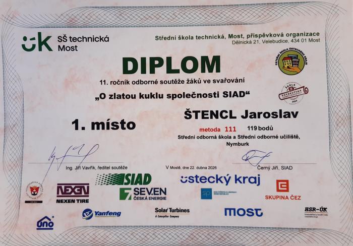 Dne 22. dubna 2026 se naši žáci vydali poměřit své dovednosti na 11. ročník prestižní soutěže „O zlatou kuklu společnosti SIAD 2026“, kterou hostila Střední škola technická v Mostě.